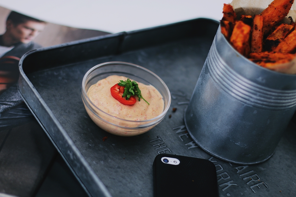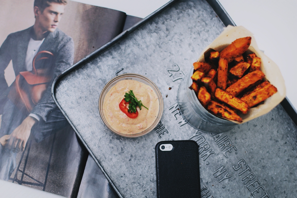 A couple of years ago I tasted sweet potato fries for the first time ever and from that moment my point of view in life was completely changed. They’re sweet but salty at the same time and million times better than typical french fries. I always order them if it’s possible to choose between those two. I have wanted to cook them for a while now but I’ve been afraid that they wouldn’t be as tasty as at a restaurant. But it was all in vain because once I got them out of the oven I was super proud of myself. They taste SO good with this recipe — and they’re kind of healthy… Well, not for me because I love to eat them with that pepper dip sauce 😀 But I love the combination so I can’t help it.